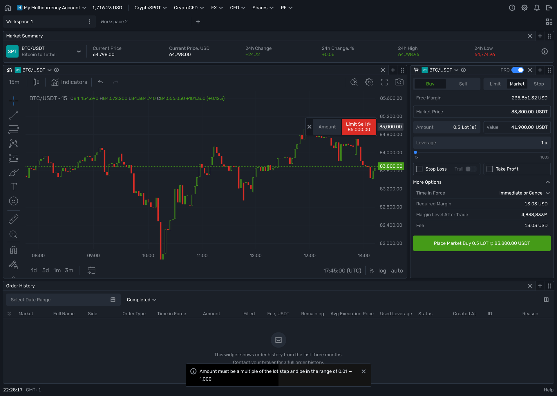 Users can place orders using predefined quantity buttons for quick access via the settings menu. Once a market order is submitted, traders will immediately receive confirmation, with real-time notifications about the order status, available in the order panel and visually on the chart.
