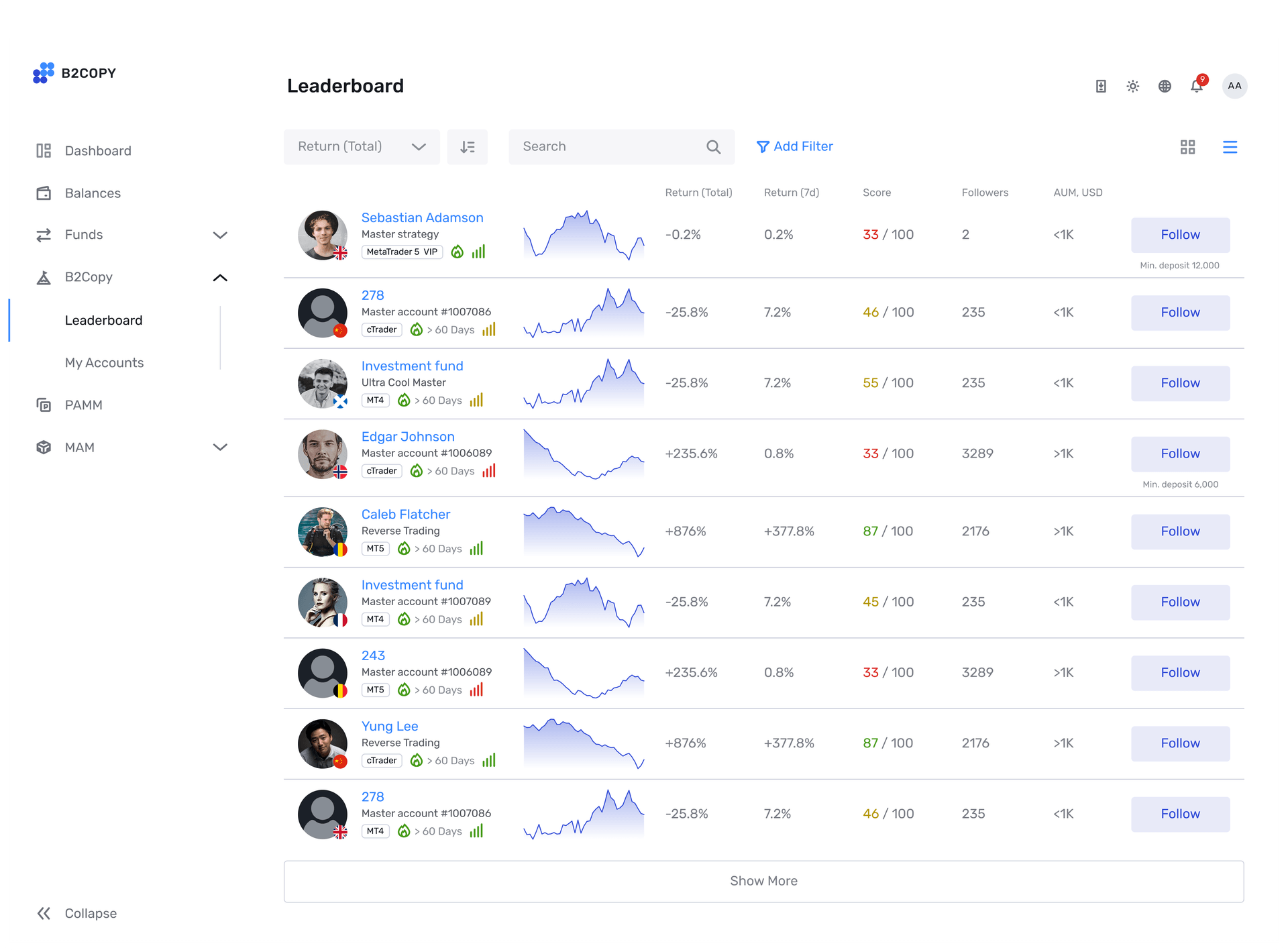 Build native interfaces using B2Copy API — integrate leaderboards, custom dashboards, and automated reports directly into your client portal.